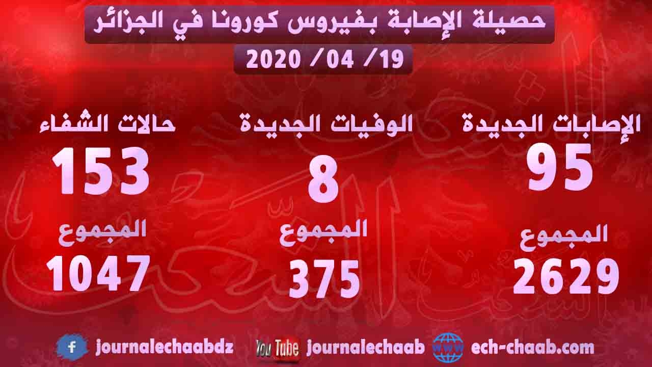 سجلت 95 حالة إصابة جديدة مؤكدة بفيروس كورونا في الجزائر ليرتفع العدد الاجمالي إلى 2629 حالة مؤكدة, فيما سجلت 8 حالات وفاة جديدة ليصل العدد الإجمالي للوفيات الى 375 حالة, حسب ما كشف عنه اليوم الاحد الناطق الرسمي للجنة رصد ومتابعة فيروس كورونا الدكتور جمال فورار.