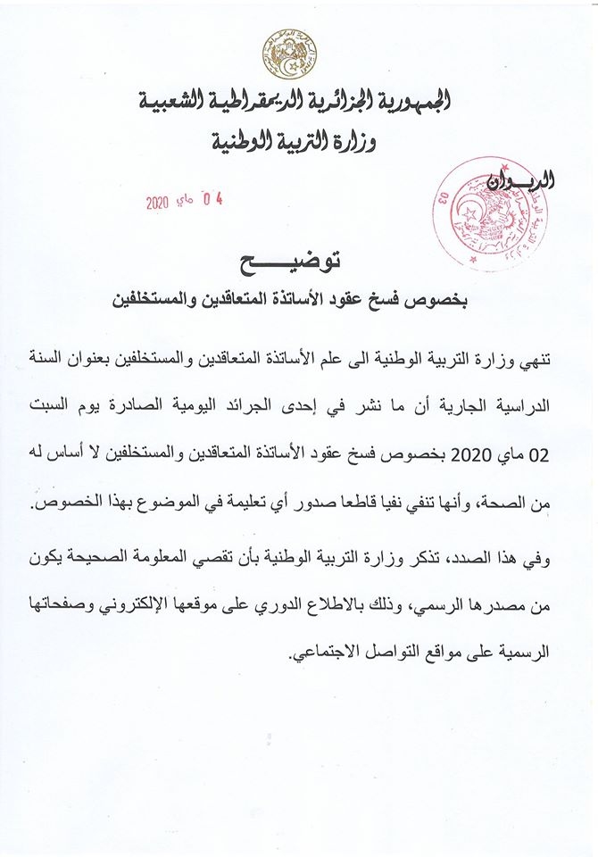 وأنهت الوزارة في بيان لها إلى علم الأساتذة المتعاقدين والمستخلفين بعنوان السنة الدراسية الجارية أن “ما نشر في إحدى الجرائد اليومية الصادرة يوم السبت 02 ماي 2020 بخصوص فسخ عقود الأساتذة المتعاقدين والمستخلفين لا أساس له من الصحة” وأنها “تنفي نفيا قاطعا صدور أي تعليمة في الموضوع بهذا الخصوص”.