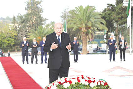 وقف رئيس الجمهورية، السيد عبد المجيد تبون أمس الجمعة، بمقام الشهيد بالعاصمة، وقفة ترحم وإجلال على أرواح شهداء الثورة التحريرية المجيدة، وذلك بمناسبة الذكرى الـ 70 لاندلاع ثورة الفاتح نوفمبر 1954.وقد وضع رئيس الجمهورية إكليلا من الزهور أمام النصب التذكاري المخلد لشهداء الثورة التحريرية المجيدة وقرأ فاتحة الكتاب ترحما على أرواحهم الطاهرة.وجرت مراسم الترحم بحضور كبار المسؤولين في الدولة وأعضاء من الحكومة.