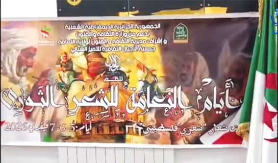 احتضنت ولاية النعامة، في أجواء ثقافية مميزة، فعاليات “أيام النعامة للشعر الثوري” التي نظمتها الجمعية الثقافية “أجيال للتميز الشباني” خلال الفترة الممتدة من 5 إلى 7 فيفري الجاري، بدعم من وزارة الثقافة والفنون وتحت إشراف مديرية الثقافة لولاية النعامة، وذلك تحت شعار “شعري فلسطيني” تعبيرًا عن التضامن العميق للشعب الجزائري مع الشعب الفلسطيني وقضيته العادلة.
