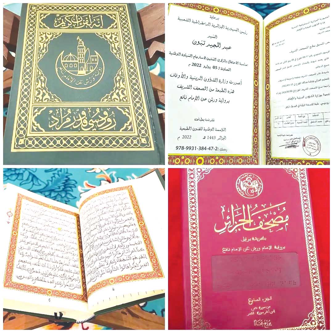وانطلاقا من الشهرة الواسعة التي اكتسبها بدول الساحل الإفريقي، حيث أطلقت عليه تسمية «مصحف الجزائر»، أصبحت عملية توزيعه مجانا على شعوب المنطقة فرصة لتعزيز الأواصر التاريخية والوشائج الروحية العميقة، التي تجمع الجزائر بالدول الأخرى في القارة. ففي إطار حرص الجزائر على خدمة القرآن الكريم ونشره وترسيخ قيمه السمحة، يتم، من خلال مبادرات نوعية، إيصال هذا المصحف العريق إلى مختلف أنحاء العالم الإسلامي، مع توزيعه على أفراد الجالية الجزائرية المقيمة بالخارج، في خطوة ترمي إلى تعزيز ارتباطها بثوابتها الدينية وهويتها الوطنية، وهي العملية التي تجري بالتنسيق مع وزارة الشؤون الخارجية. في سياق ذي صلة، يبرز مصحف الجزائر المطبوع بطريقة برايل، هو الآخر، كجزء من الجهود التي تبذلها الجزائر من أجل ترسيخ القيم السامية للقرآن الكريم، حيث تم إصداره بأمر من رئيس الجمهورية، في إطار العناية التي يوليها لفئة ذوي الاحتياجات الخاصة، علما أنّ وزارة الشؤون الدينية والأوقاف تتكفّل بتوزيع هذه النسخة مجانا على فئة المكفوفين عبر كامل التراب الوطني. كما يجري توزيعه أيضا عبر دول العالم الإسلامي، وكذا لفائدة أفراد الجالية الجزائرية بالمهجر، دعما لجهود الإدماج الديني والاجتماعي وترسيخا لقيم التضامن والتكافل. وقد طبع هذا المصحف سنة 2023 في نسخة فريدة من نوعها، تجمع بين الكتابة العادية والكتابة بطريقة برايل، بما يتيح الاستعمال المشترك ويعزّز الإدماج والتواصل بين مختلف فئات المجتمع. وقد أشرفت على إعداد هذا العمل لجنة فرعية مختصة في طريقة برايل، تحت متابعة لجنة تدقيق ومراجعة نسخ المصحف الشريف بوزارة الشؤون الدينية والأوقاف، من أجل ضمان سلامة النص القرآني ودقته واحترام الضوابط العلمية والرسم العثماني المعتمد.