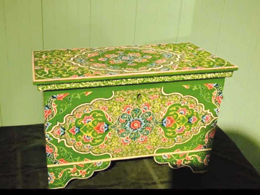 وفي هذا الإطار تعرض جازولي زكية مجموعة من أعمالها على غرار صندوق خشبي أخضر اللون كبير الحجم معروف بـ«الفنيق” مزين بزخرفة غاية في التنسيق بين الألوان والتصميم، وكذا مجموعة من أخرى من الصناديق الخشبية بأحجام صغيرة تستخدم كقطع أساسية في جهاز العروس بالعاصمة، بأشكال وزخارف تستلهم من الطبيعة متقنة التشكيل وبلمسة جميلة.