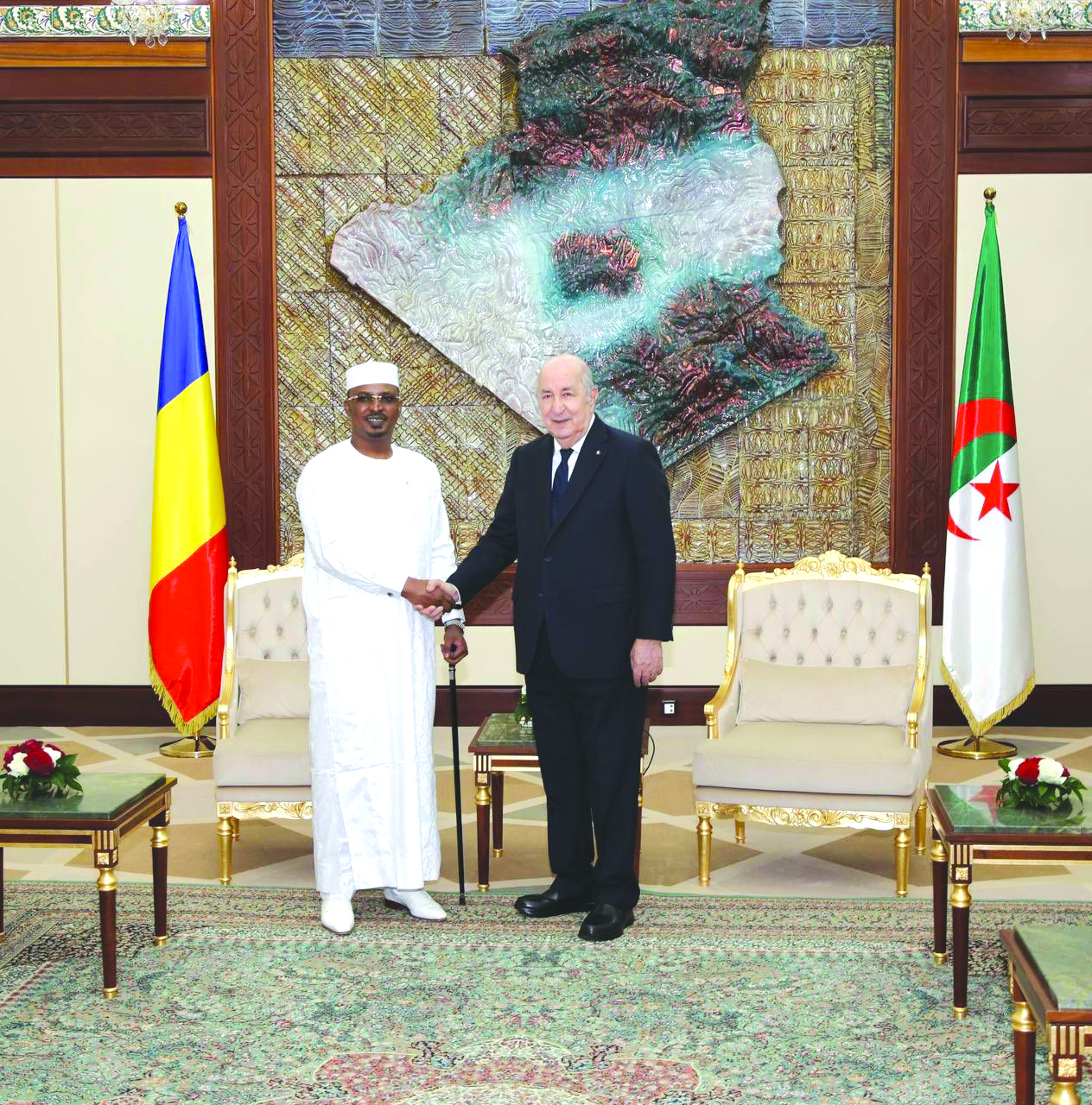 وأبرز رئيس الجمهورية – بالمناسبة – أن الزيارة الرسمية التي يقوم بها رئيس جمهورية تشاد إلى الجزائر “تعبر عن إرادتنا السياسية المشتركة لمواصلة المسار الذي رسمناه معا خلال الزيارة التي قام بها فخامته إلى الجزائر في سبتمبر الماضي”.